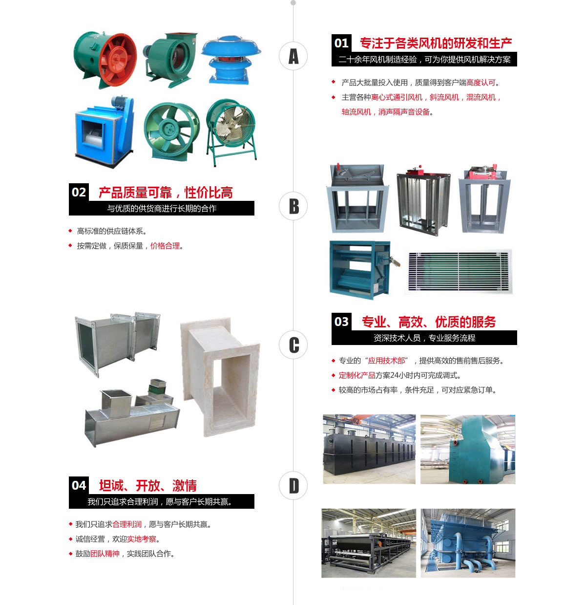本公司專業生產各種離心式通引風機,斜流風機,混流風機,軸流風機,軸流風機,不銹鋼排風機,全塑封機,高溫風機,消聲隔聲音設備,以及各種特殊用途的不銹鋼、鈦材、玻璃鋼、塑料及襯膠、貼瓷等不同材質的防腐、防爆和耐高溫的高效低能耗新型風機。同時生產各種水處理、消煙除塵、焚燒爐等環保設備設施。產品廣泛應用于鋼鐵、冶金、醫藥、化工、紡織、煤礦、市政等各行業。